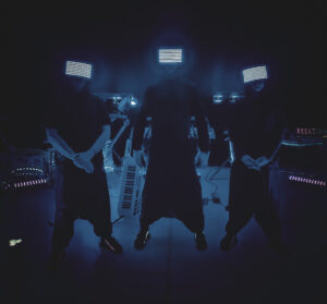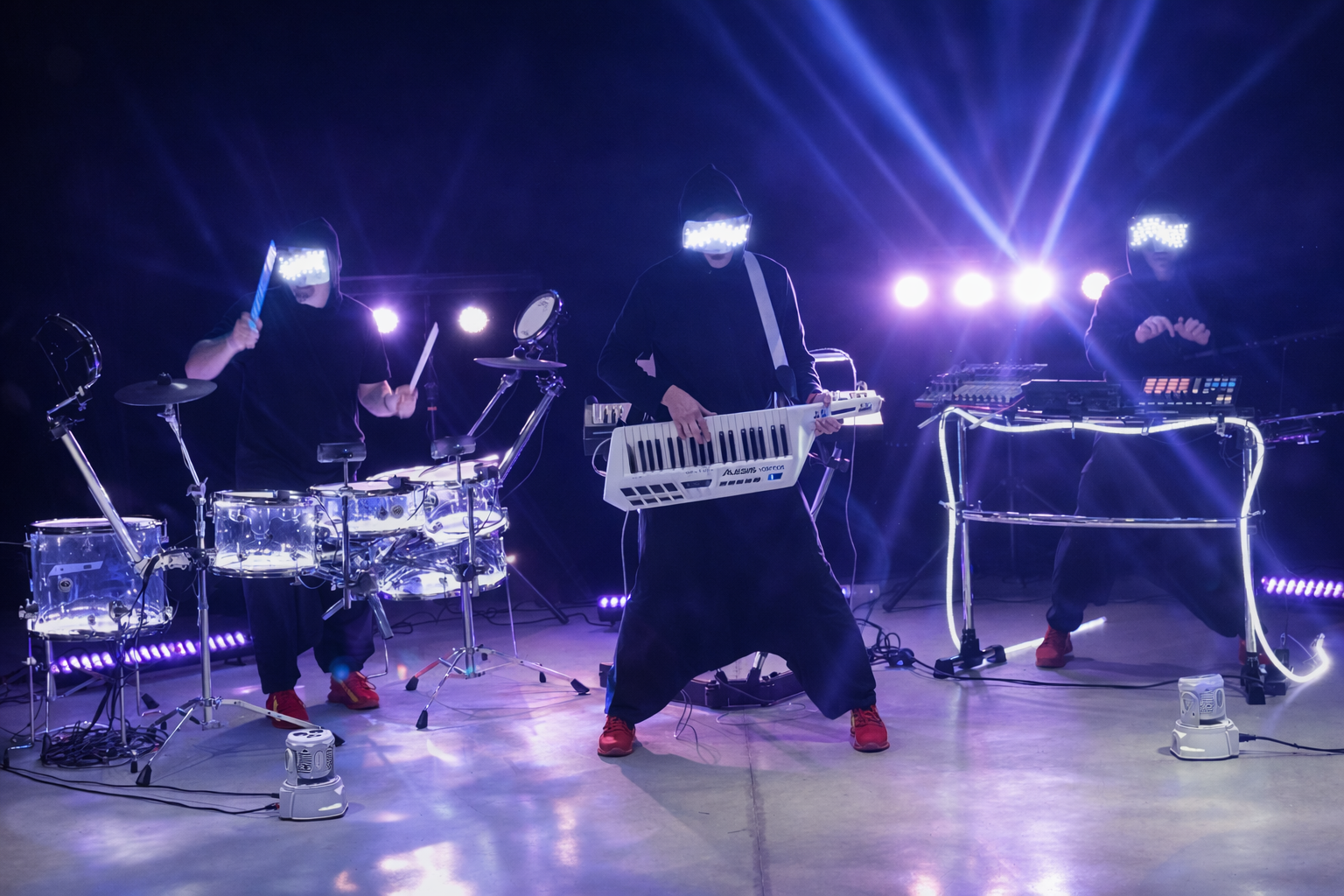 Groupe de percussions portant des masques à LED dont les motifs changent avec la musique.