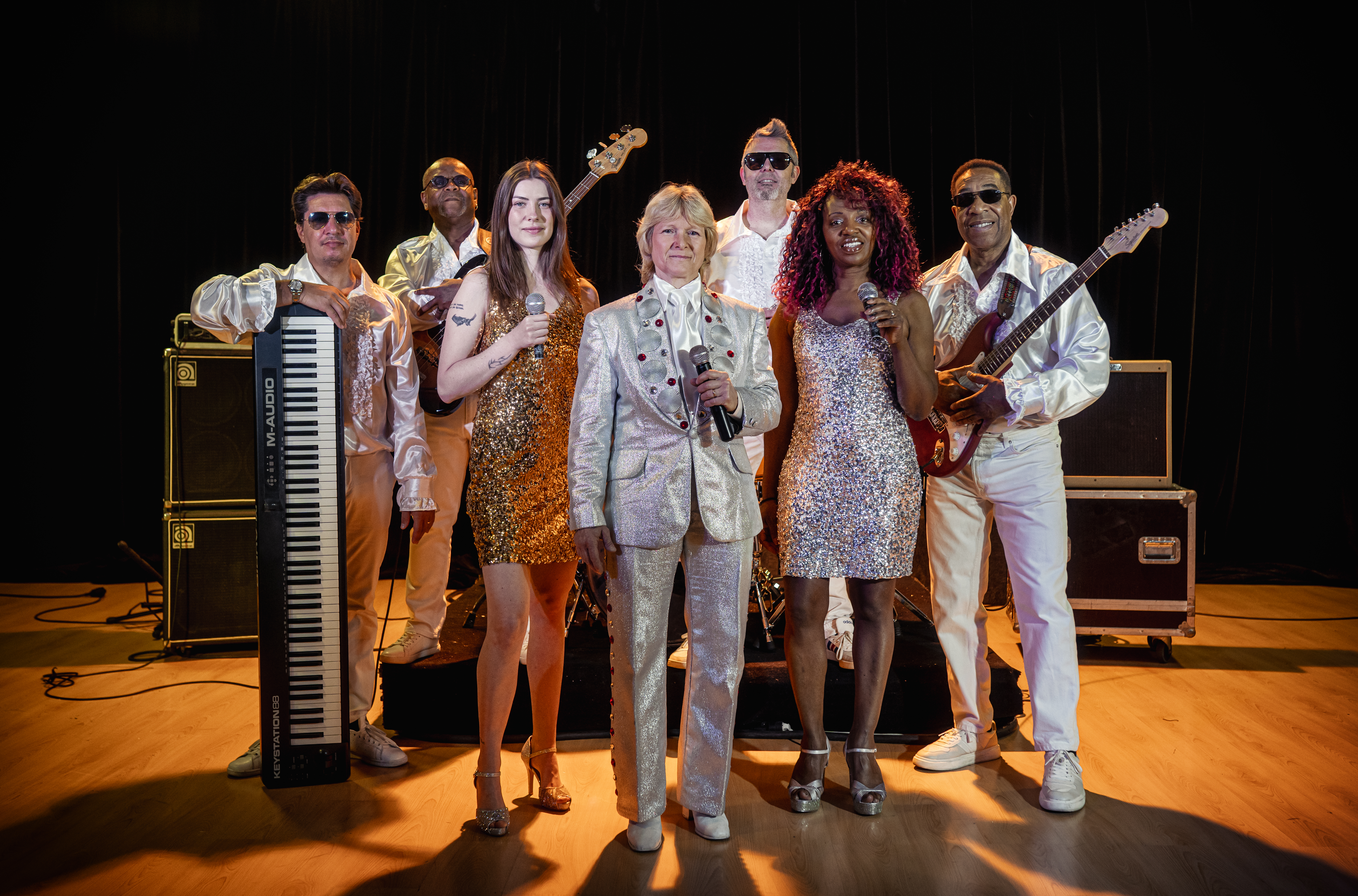8 performers + look-alike: bass, drums, guitar, keys, 2 backing vocalists, 2 dancers + Marion -